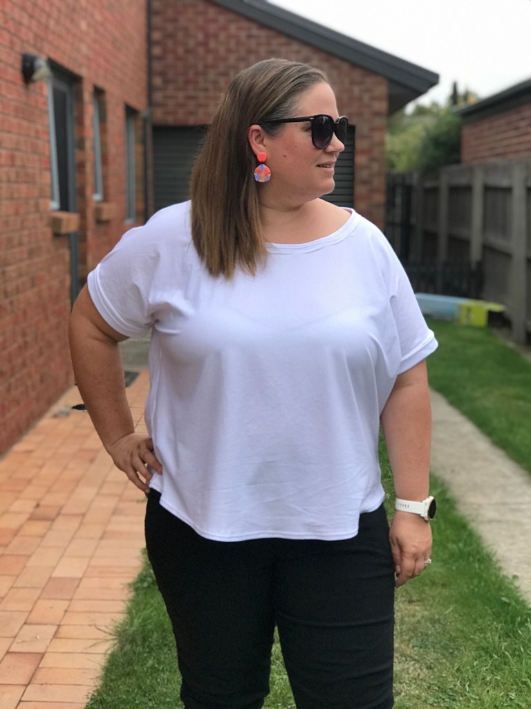 Happy with my test result, I decided to move on to my next one and chose a plain white Cotton Spandex from the Australian supplier Lush Fabrics. Liking the neckline of my test make I also stuck with the relaxed neckline for this top but this time round opted for the short length with a regular cuff. I am absolutely in love with the end result and how it pairs with jeans, shorts or a skirt. For me I found this to be the perfect length, super comfy and a really basic sew suitable to any beginner sewer.