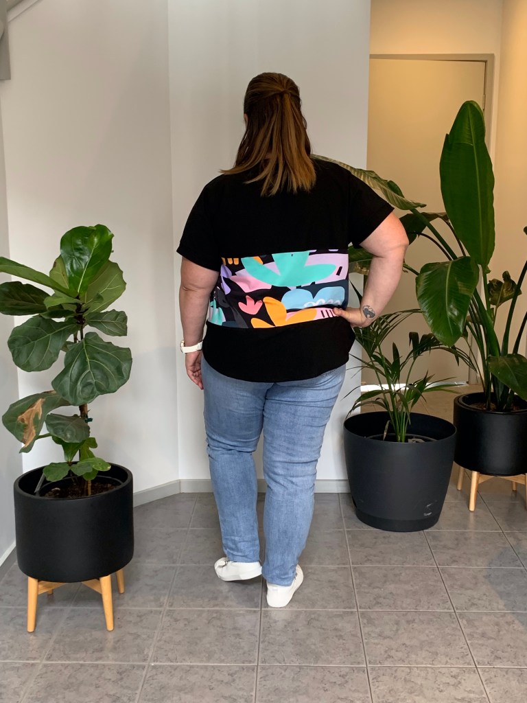 Having found success in my previous makes I decided to push the boundaries a little with the next one and experiment with a little pattern hack in the form of some colour blocking. For this I chose a solid black Cotton Spandex from LUSH fabrics and paired it with the colourful print “Rock Garden – in black” (Mega Scale), designed by Rach Jackson for Material Difference. Once again I went with a relaxed neckline, short length and straight cuff sleeves. Pretty happy with my first attempt at colour blocking although the front and rear does not quite match up. Can definitely see more colour blocking in by future.