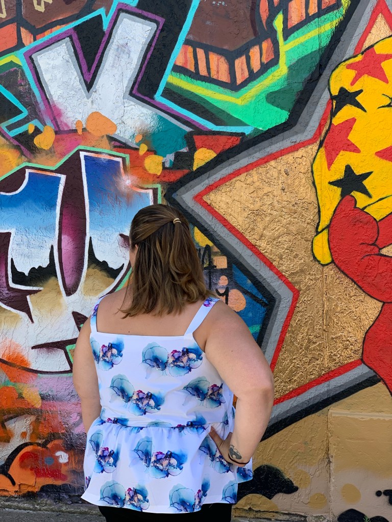 For my first attempt at this pattern I had 1m of this gorgeous blue alcohol ink print woven fabric in the cupboard that was calling to be made into a top. Bodice is the V-neck option featuring wide staps. I added a single tier which I had aimed to cut at the long (regular) length but due to a slip of the rotary blade ended up being slightly shorter. I then finished with fusible hemming tape.